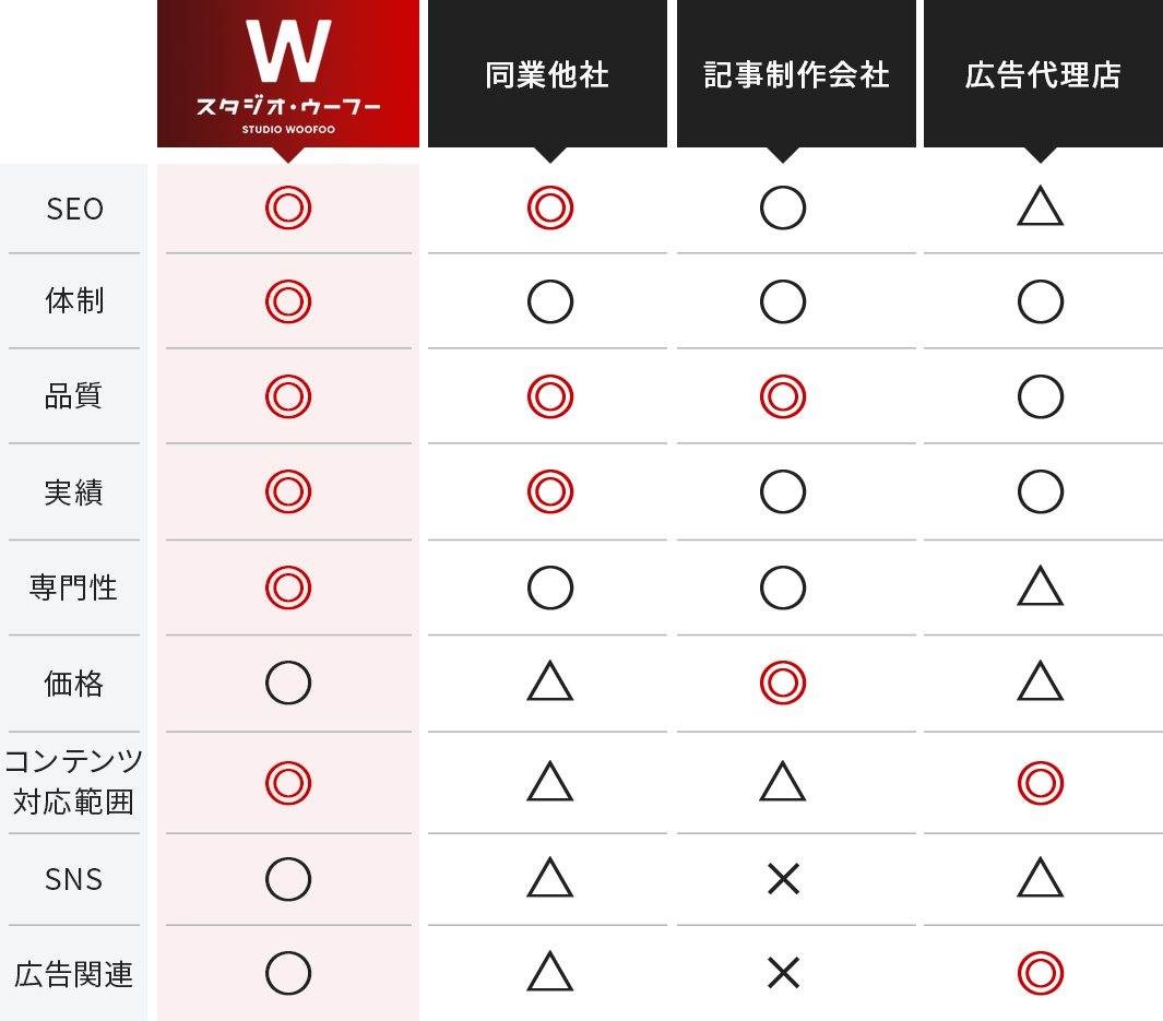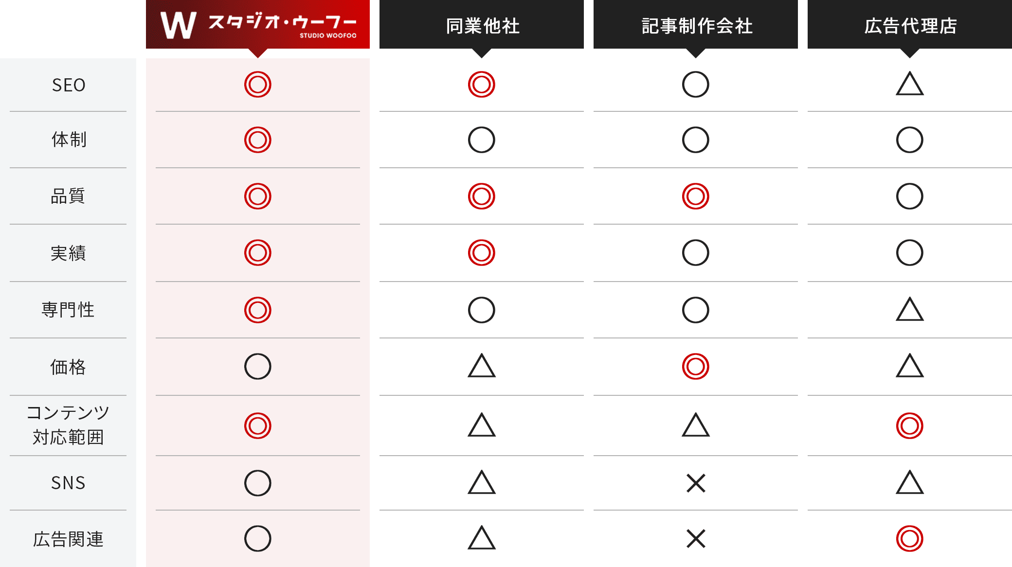 過去10万件を越すコンテンツ制作を手がけてきたディレクター陣が、原稿執筆から撮影・イラスト制作まで一手に承ります。編集プロダクション「スタジオ・ウーフー」では1対1で専任のディレクターとやり取りをするだけ。